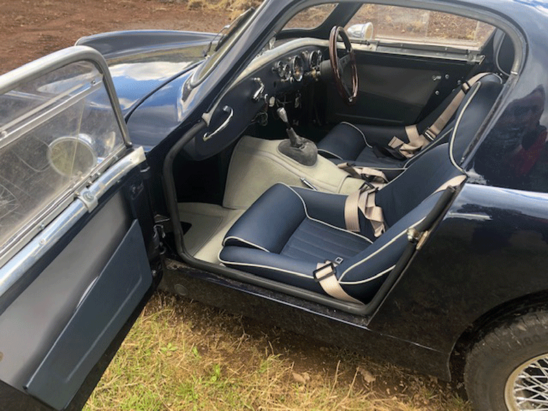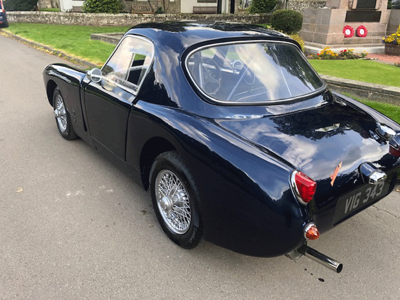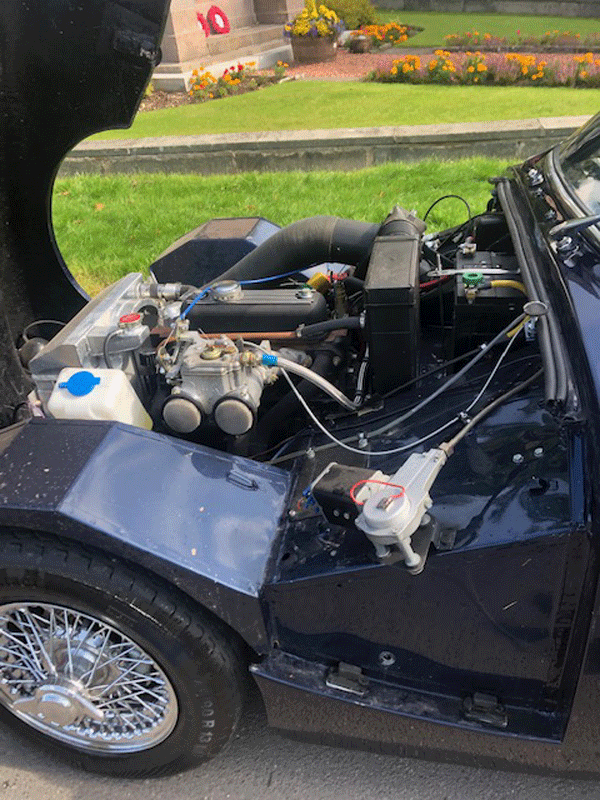 Offered for sale reluctantly due to the owner’s health issues. Body panels are Tifosi from Halls Garage, Bourne the car finished in midnight blue. Purchased in 2017 it was only completed in May this year. Fitted with an all-new floor and boot one piece section all soda blasted then primed and baked in spray oven. Not one for the purists, it features Frontline telescopic shock absorbers front and rear. Engine bored out to 1310cc with a Keith Calver cylinder head and engine spec too big to itemise here but would be happy to send details to any prospective buyer. Finished in a very attractive dark blue paint with grey carpets. Blue seats with grey piping. Two sets of wire wheels. One set in chrome for show use and one set in black enamel for road use, both with brand new tyres fitted. Offers are sought for the car which has an insurance agreed value of £20,000. It is garaged 15miles south-west of Edinburgh.