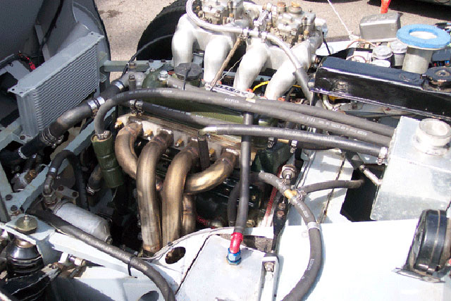 Engine and transmission developments included several wet sump engines fitted with a wide shallow high-capacity sumps, before the dry-sumped XSP engines of varying capacities came along. Seeing that Geoff Healey was running MGB overdrive gearboxes in his competition Sprites, Jack followed suit, these ideal for circuits like the “Little Madonie” with long straights followed by twisty mountain sections. Later he acquired one of the few 5-speed boxes developed by Donald Healey/BMC. Jack also managed to borrow an 8-port cylinder head from Eddie Maher of BMC (this has often been referred to as the Weslake head, but Jack says it is in fact one developed by Morris Engines. Harry Weslake’s grandson apparently has one of the true Weslake heads which is somewhat different. Jack Cramp, Weslake’s flow-tester, who still lives near their former base, in Rye, Sussex was able to give Jack this information – the Weslake head has round exhaust ports while the Morris ones are square). He was lucky to be given the inlet manifolds by Paul Ivey, who he was not meet again for over 30 years. The manifolds had been made by Bob Eccles, and when Jack needed another set for the much more recent re-build, Bob’s pattern-making company was able to oblige once again. They went to enormous trouble to re-create these manifolds from scratch, for which Jack is very grateful. Another modification was to create dual-circuit brakes using twin Girling master cylinders in the Sebring pedal box, and fabricating a separate narrow box for the clutch cylinder and pedal.