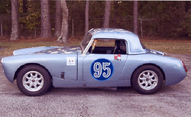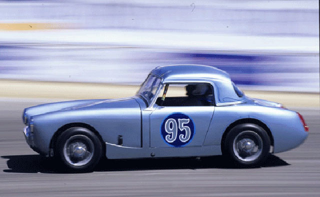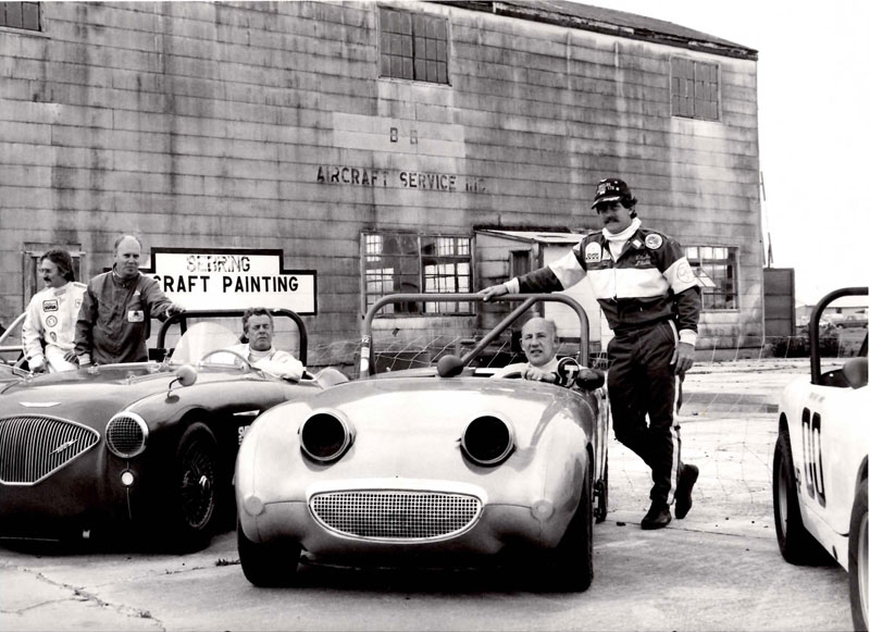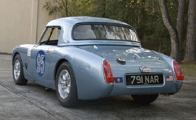 “Hello Martin, I found [the car] in a small trade paper in the UK and comissioned the body restoration there. It revealed numerous colors and several accidents in the past and primarily used as a club racer. Badly rusted, most floors were replaced along with some body sections. Doors and boot lid were aluminum, top and bonnet were fibreglass. We attempted to trace history but with little luck. Sent to the US in 1986, we built a 997cc motor, billet crank, Carrilo custom rods, roller rockers, etc. We “O” ringed the heads and ran 13.2:1 compression. Power band was from 4300 rpm to 7800 rpm (!!). dyno’ed at 138 bhp. Depending on the track, we either ran a 4.88:1 or a 5.12:1 diff (the latter was used for mail delivery mini vans and nearly impossible to find). We sent the car to the UK in 1990 to compete in the Pirelli Marathon (S. Moss and I as a team) with 11:1 heads and 4.55:1 diff, but as the clearance was quite low, we opted for a ’66 MGB. Returned it to USA and then sold it in 1994. It was then infrequently raced and subsequently sold at the Amelia Island auction in 2010. I do not know the current owner or if he/she is racing it. Thanks for the info about JAX12. I do now recall the placard 971 NAR being on the car. The first photo you have on the site [top right] features Sir [Stirling] Moss driving the car here in USA, probably in the late ’80’s. Moss was a frequent guest driver of my Sprite in the USA and the Bahamas. He loved the car, saying ‘It is incredibly agile, deceptively fast and one of the best historic production cars…’ he’d driven.
