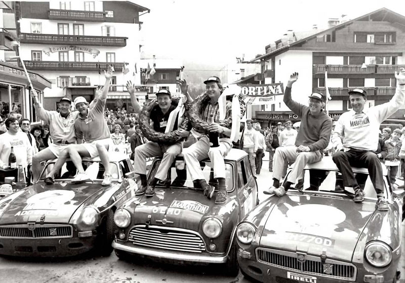 I’ve attached a photo from the 1990 Pirelli Marathon – London to Cortina – with Moss and I. Moss so wanted to compete with my Sprite, but it was just too low for the back roads in France, Germany, Italy, so we opted for a MGB. In the ‘winners’ photo, is Paddy Hopkirk with Alec Poole and Ron Gammons with his co-driver. Also, attached, a pic from Sebring, 1983 or ’84 with another Sprite I raced; Moss in the seat and Augie Pabst (a well known US driver) in the seat of the A-H 100, and another photo of Moss driving my old Sprite. Best regards, C.”